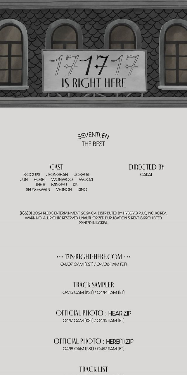 스케줄러에 따르면, 오는 7일 0시 ‘17 IS RIGHT HERE’의 프로모션 웹사이트가 열리고 뒤이어 트랙 샘플러, 오피셜 포토, 트랙 리스트, 하이라이트 메들리, ‘고잉 세븐틴’ 스페셜, 오피셜 뮤직비디오 티저 등 다채로운 콘텐츠가 순차적으로 공개된다.