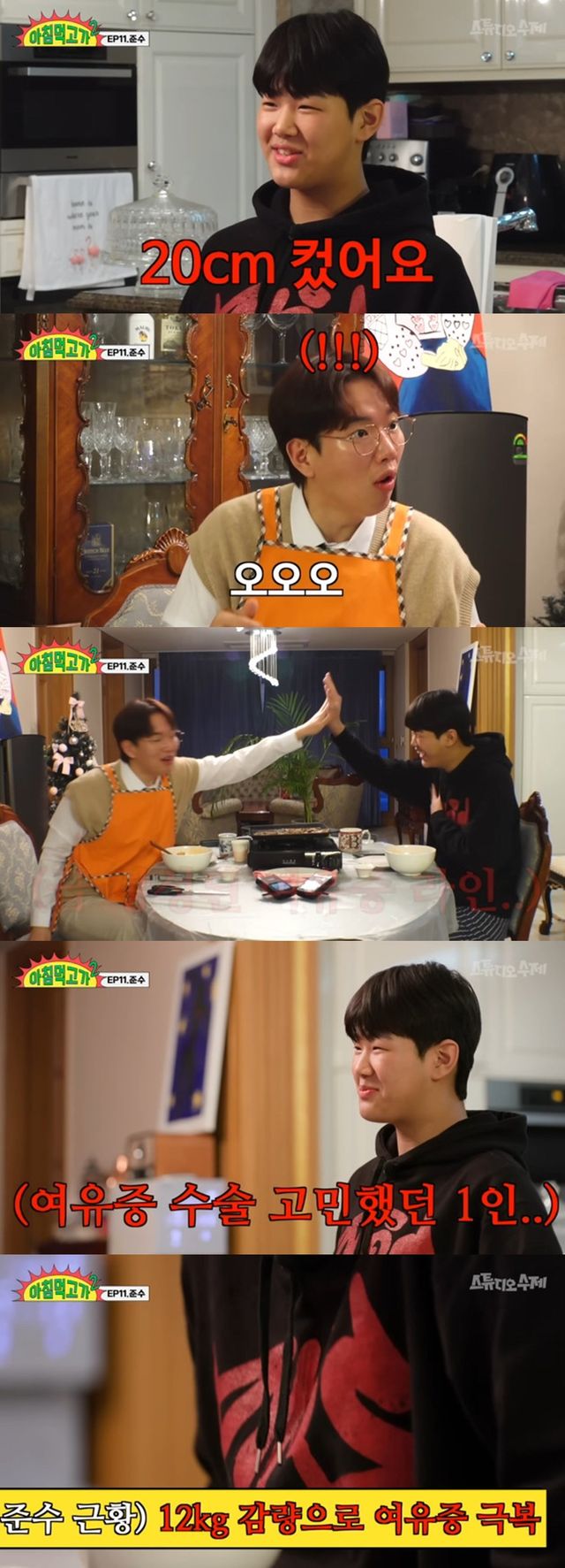 이에 장성규는 “근데 몸무게는 12kg 뺐는데 그 사이에 키가 얼마나 컸냐”라고 묻자 준수는 “20cm가 컸다”라고 현재 학교에서 키로 전교 1등이라고 밝혔다.