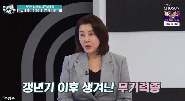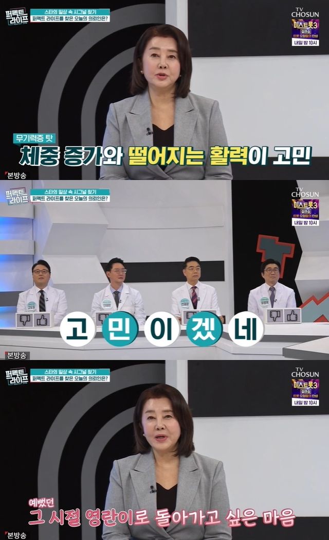 3일 방송된 TV CHOSUN '퍼펙트 라이프'에는 배우 김영란이 등장해 갱년기 후 변화를 토로했다.