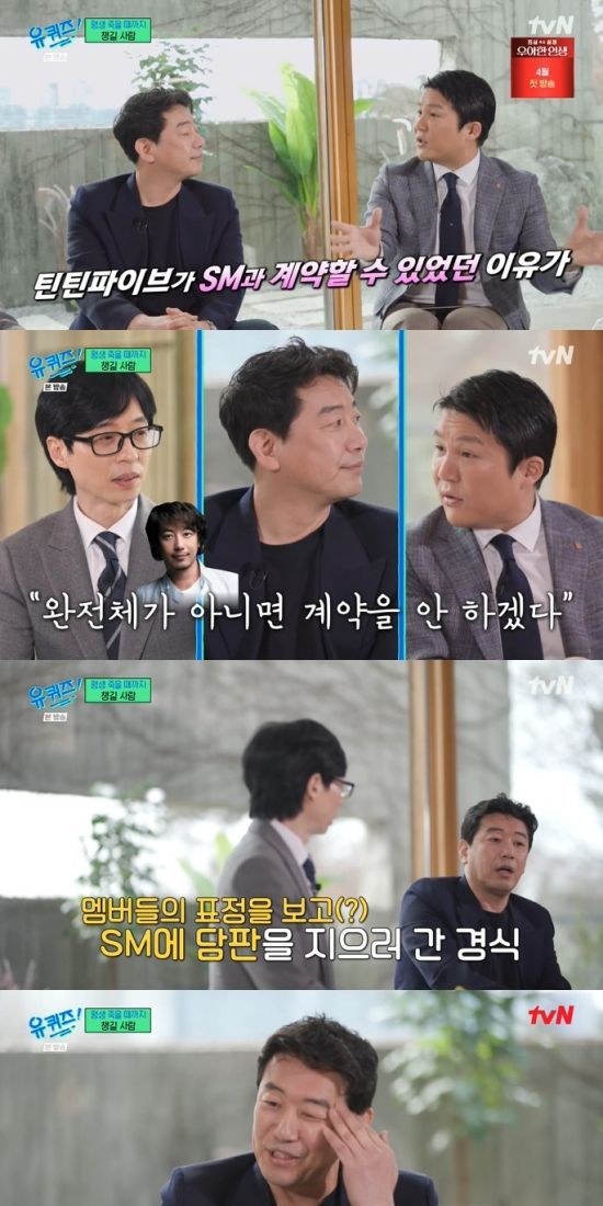 김경식은 "계약 먼저 하고 왔는데 나머지 표정들이. 그래서 내가 그때 이야기를 드렸다. SM에다가. '저만 계약하는 게 좀 그렇고 나머지 팀원들도 같이 활동해야 하는데 스케줄도 안 맞을 거 같고 같이 계약하면 안 되겠냐'라고 그랬더니 (이수만이) '당장 해라. 안 했어? 바로 해'라고 해서 바로 흔쾌히 했다"라며 설명했다.