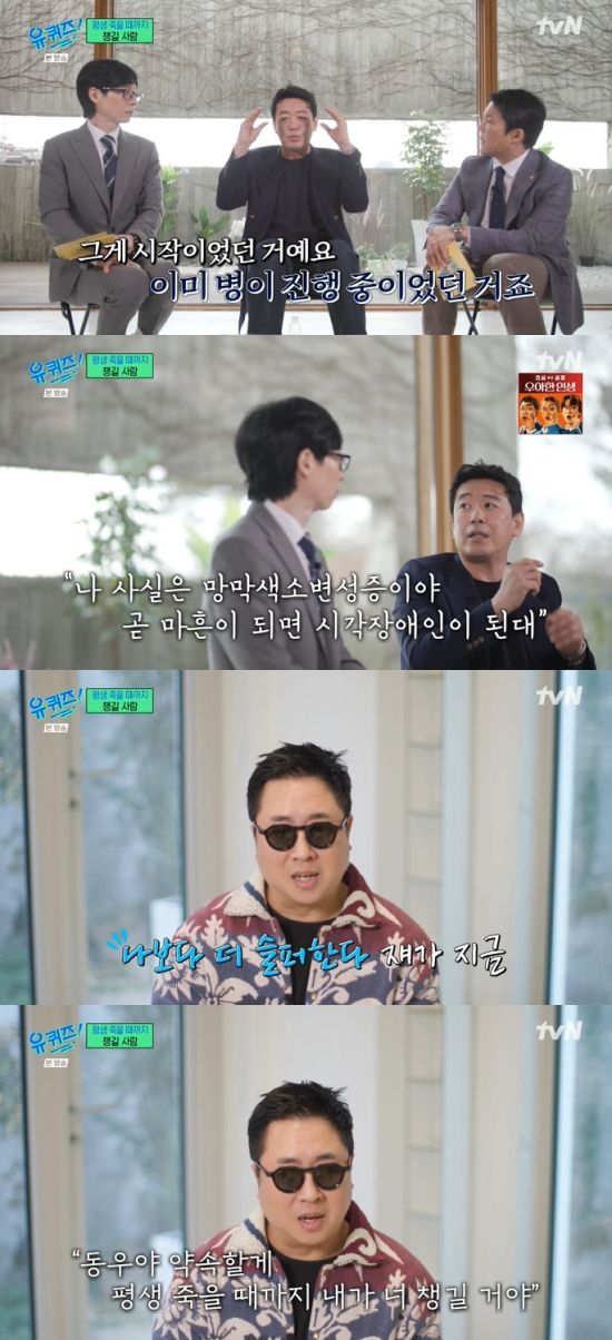 김경식은 "그게 시작이었던 거다. 갑자기 셧 다운이 아니라 천천히 조금씩 좁혀져 왔던 거다. 어느 날 연습실에서 오픈을 했다. '나 사실은 망막색소변성증이야. 곧 마흔 되면 닫히게 된대. 안 보이게 될 거야' 하는데 그때 당시 저희가 굉장히 놀랐다. 그때부터 나이가 동갑이고 그러다 보니까 동우랑 자주 만나지 않았나"라며 전했다.