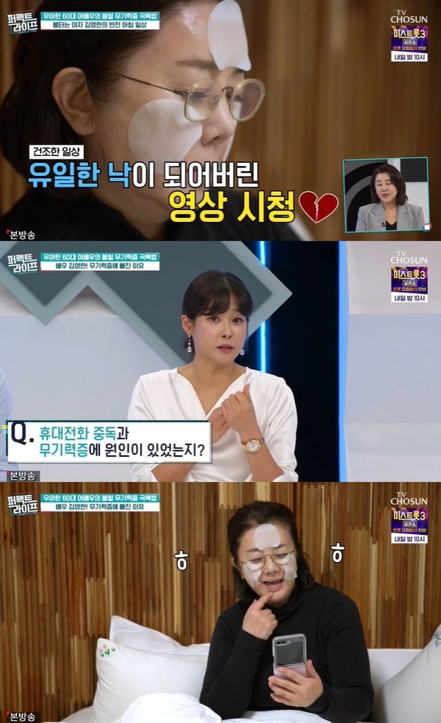 "휴대전화 중독과 무기력증에 원인이 있냐"는 질문에 김영란은 "이유는 잘 모르겠지만, 나이가 들면 새로운 게 없고 똑같은 일상이 반복된다"고 토로했다.