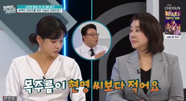 김영란의 깜짝 등장에 전문의는 "MC 현영보다 목주름이 적다"며 감탄했다. 이에 현영은 "스카프 달라"고 반응해 웃음을 자아냈다.