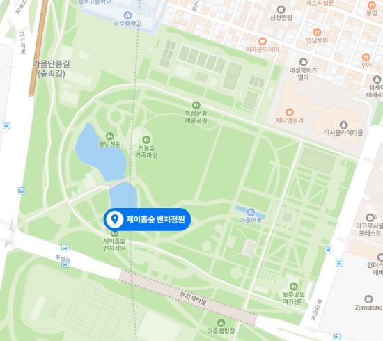 제이홉 벤치공원은 서울숲 내 커뮤니티 센터 인근에 있으며, 뚝섬서울숲 버스정류장에서 약 5분 거리다.