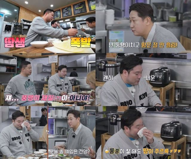 뽀송뽀송한 이대호와는 상황이 많이 다른 박광재는 연신 얼굴을 닦아내며 "나는 지금 속에 에어리즘 입었단 말이야"라고 호소해 웃음을 자아낸다.