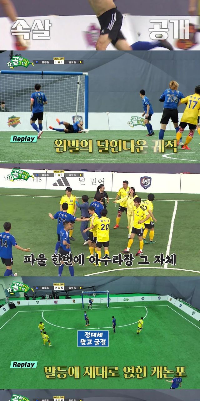 첫 골은 블루팀의 현영민이 만들어냈다. 선제골을 넣은 현영민은 깜짝 상의 탈의 세리머니를 펼쳤고, 옐로카드를 받아 모두의 웃음을 자아냈다. 첫 골의 여운이 가시기도 전에 옐로팀은 골키퍼 하석주의 강슛으로 만회골을 만들어냈고, 이운재는 "경기가 치고 받고다"라며 감탄을 터뜨렸다.