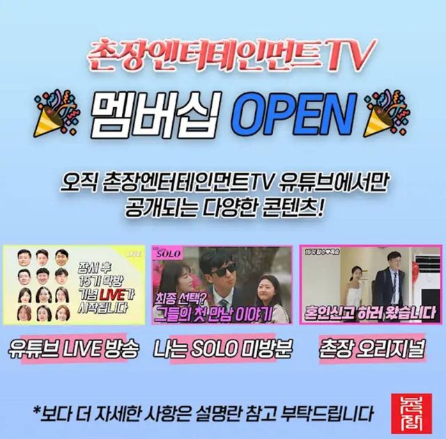촌장엔터테인먼트 측은 이날 갑작스럽게 유료 멤버십 소식을 알리며 "'구독' 버튼 오른쪽에 '가입'을 눌러 달라"고 안내했다. 이에 따르면 월 7990원을 지불하고 멤버십에 가입해야 유튜브 라이브 방송과 '나는 솔로' 미방송분, 오리지널 콘텐츠 등을 볼 수 있다.