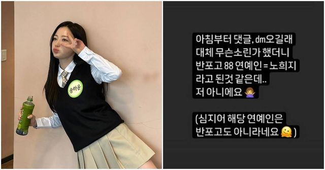 노희지는 4일 자신의 SNS에 “아침부터 댓글, DM 오길래 대체 무슨 소리인가 했더니 반포고 88 연예인=노희지라고 된 것 같은데. 저 아니에요”라고 말했다.