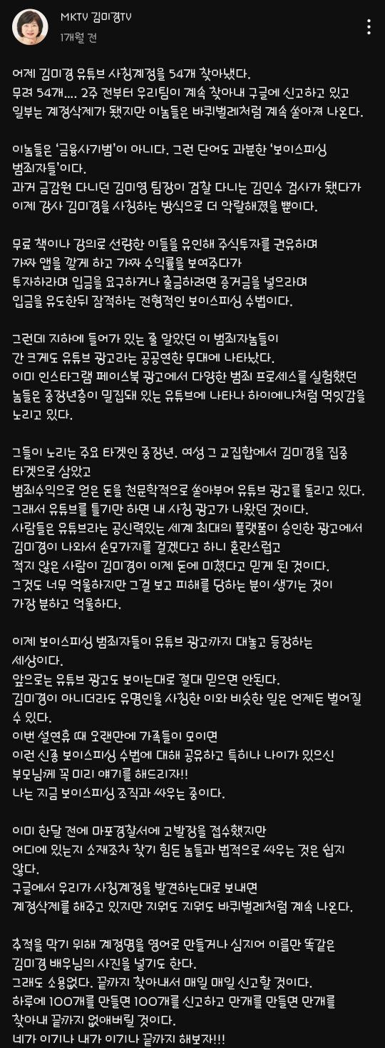 송은이를 비롯해 김미경 강사, 김영익 서강대 교수, 도티(유튜버), 존리(전 메리츠자산운용 대표), 주진형(전 한화투자증권 대표), 황현희 등이 주축이 되어 결성한 '유명인 사칭 온라인 피싱 범죄해결을 위한 모임'(이하 유사모)은 오는 22일 오후 2시 30분 프레스센터 19층 기자회견장에서 공식 기자회견을 진행한다.