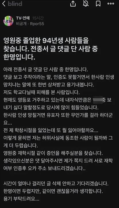 그는 “Y중 재학 시절 같이 증언해주실 분을 찾는다. 생각 있으신 분은 댓글 달아주시면 제가 쪽지드려 서로 재학 여부 인증 후 주소를 보내드리겠다”며 “시간이 얼마나 걸리던 글 삭제 안하고 기다리겠다”며 “한 명이면 두렵지만 같이라면 괜찮을 거라고 생각한다. 용기 부탁드린다”고 제안하기도 했다.