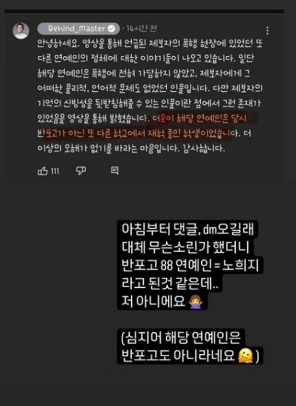 이어 "심지어 해당 연예인은 반포고도 아니라네요"라며 관련 의혹에 강력히 반박했다.