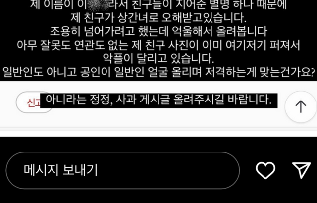 하지만 A씨의 친구가 인스타그램을 통해 "제 이름이 OOO이라서 친구들이 지어준 별명 하나 때문에 제 친구가 상간녀로 오해받고 있다."면서 억울함을 토로했습니다. 그는 "아무 잘못도 연관도 없는 제 친구 사진이 이미 여기저기 퍼져서 악플이 달리고 있다. 일반인 얼굴 올리며 저격하는게 맞는건가."라고 문제를 제기했죠.