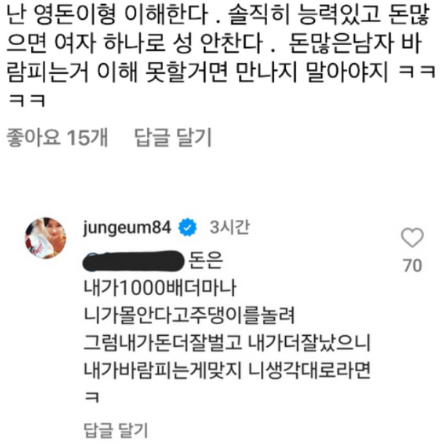 또 "돈 많은 남자 바람 피우는 거 이해 못할거면 만나지 말아야지"라는 악플에는 "돈은 내가 1000배 많다. 네 생각대로라면 내가 돈 더 잘 벌고 내가 더 잘났으니 내가 바람 피우는게 맞지 않냐"라고 분노했습니다. 이어 "내가 바람 피우는 놈인지 알고 만났겠냐", "내가 한 번은 참았다"라며 남편의 외도가 이번이 처음이 아니라고 주장하기도 했습니다.