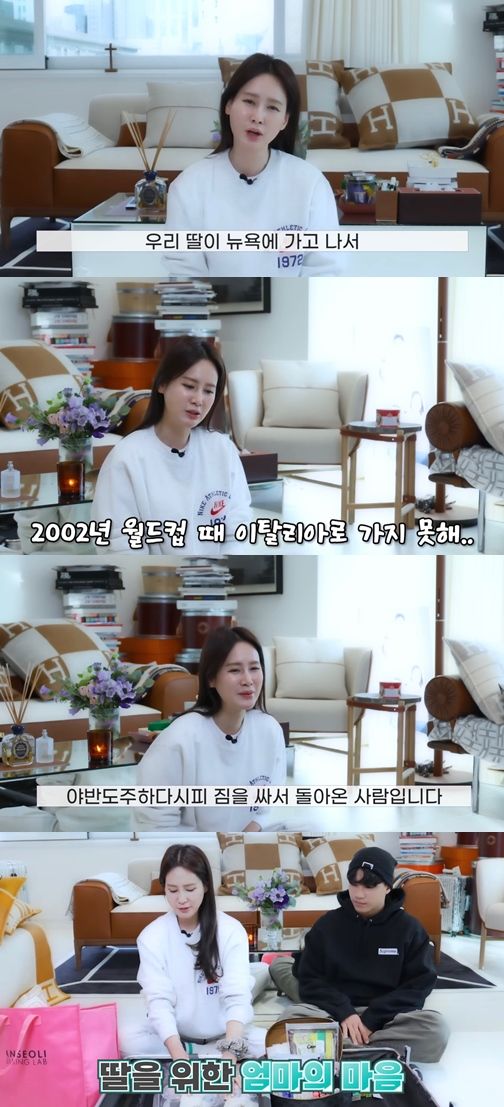 이어 "제가 외국 생활을 거의 15년을 했다. 저의 짐싸기 실력이 어느 정도냐면 우리 남편이 2002년 월드컵 때 이탈리아로 돌아가지 못한 사건이 있었지 않냐. 야반도주하다시피 제가 짐을 싸서 돌아온 사람이다. 짧은 시간 안에 짐을 싸는 기술을 가지고 있다"라고 말해 웃음을 자아냈다.