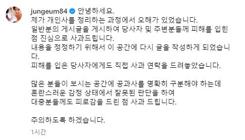 4일 황정음은 자신의 인스타그램을 통해 "제가 개인사를 정리하는 과정에서 오해가 있었다"며 "일반인의 게시글을 올려 당사자 및 주변 분들께 피해를 준 점 진심으로 사과드린다"고 밝혔다.