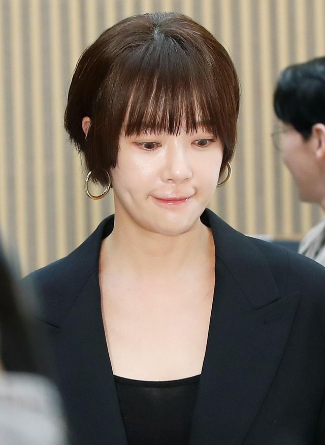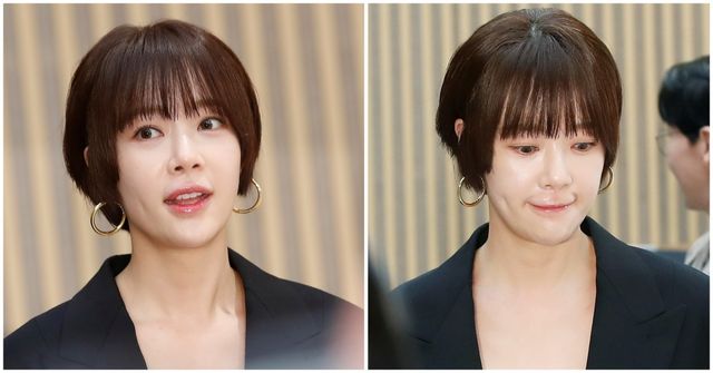 파경 소식이 전해진 이후 첫 공식 석상에 모습을 드러낸 황정음. 지난달 한 드라마 제작발표회에 참석한 황정음이 고개를 떨구고 있다. / 뉴스1