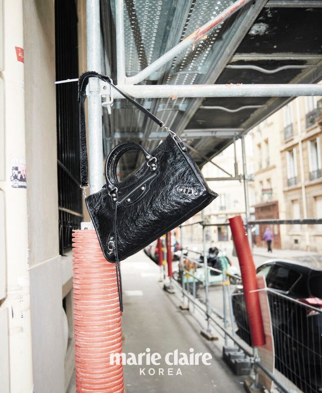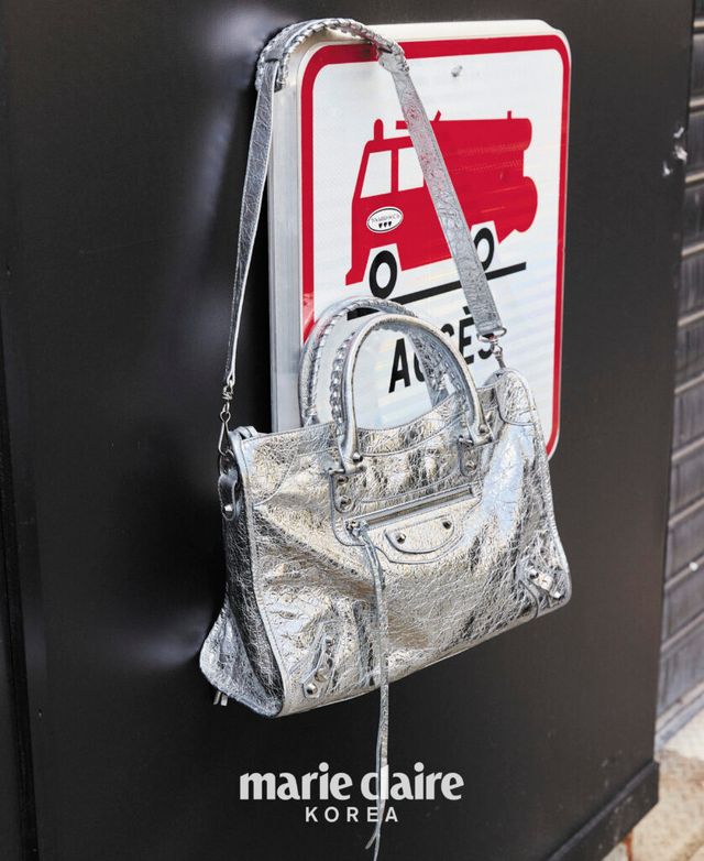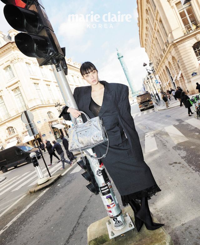 박시한 컷어웨이 재킷, 브이넥 시스루 톱, 란제리 테일러드 스커트, 스판덱스 부츠, 실버 어레나 램스킨 르 시티 백 모두 가격 미정