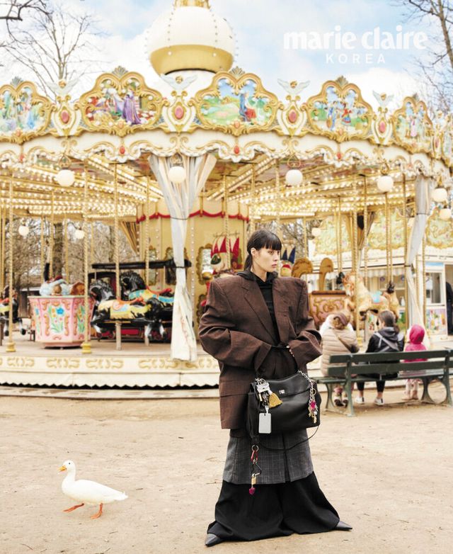 박시한 싱글 브레스트 재킷, 롱 슬리브 후드 티셔츠, 레이어드 테일러드 스커트, 블랙 슈즈, 참과 빈티지 실버 장식이 돋보이는 로데오 라지 핸드백 모두 가격 미정
