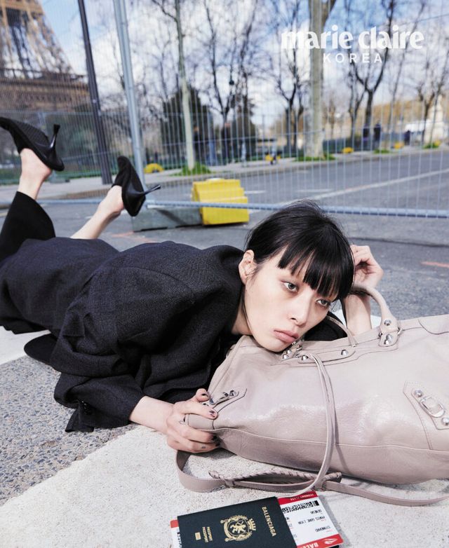 박시한 다크 그레이 재킷, 레이어드 테일러드 스커트, 블랙 펌프스, 베이지 어레나 램스킨 르 시티 백, 여권 모양 지갑 모두 가격 미정