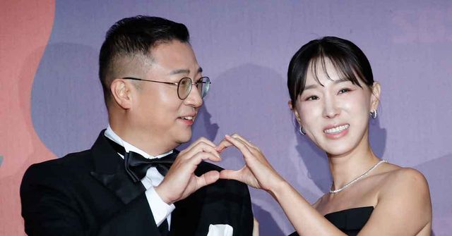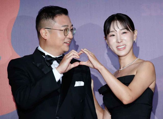 '너는 내 운명' 문재완, 이지혜 부부가서울 마포구 상암 SBS 프리즘타워에서 진행된 ‘2023 SBS 연예대상’ 레드카펫 행사에서 포즈를 취하고 있다. / 뉴스1