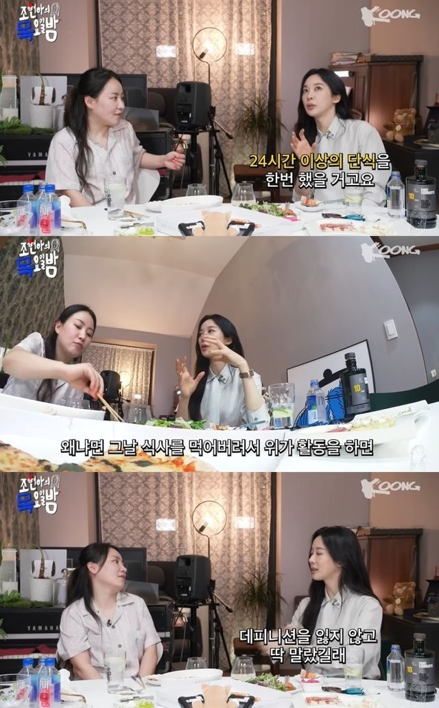 이청아는 "위가 활동을 하면 일단 부피감이 생긴다. 하루 이틀 전부터는 칼로리 문제가 아니라 먹는 양이 문제다"라며 "그땐 오히려 음료 종류를 마셔서 바로 내려가는 게 몸통이 안 두꺼워진다"고 설명했다.