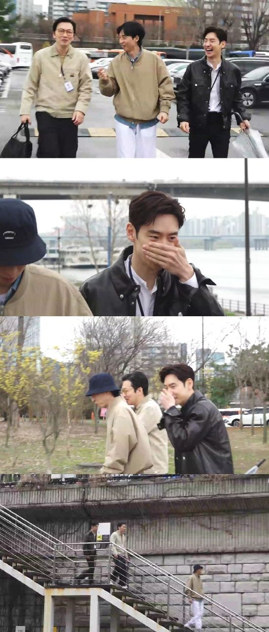 고개를 숙인 채 한강을 활보 중인 세 사람의 어설픈 모습은 오히려 더 수상쩍어 시선을 강탈한다. 이동휘는 “저희 ‘놀면 뭐하니?’ 촬영 중 아닙니다”라고 능청을 떨고, 유재석은 시민들이 보이자 “오늘은 인사하지 마”라고 은폐엄폐를 시도한다.