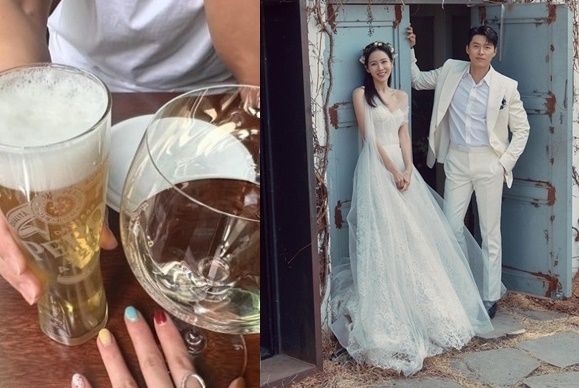 공개된 사진에는 맥주와 와인을 즐기고 있는 손예진의 모습이 담겼다. 맞은 편에 앉은 사람은 남편 현빈으로 보인다.