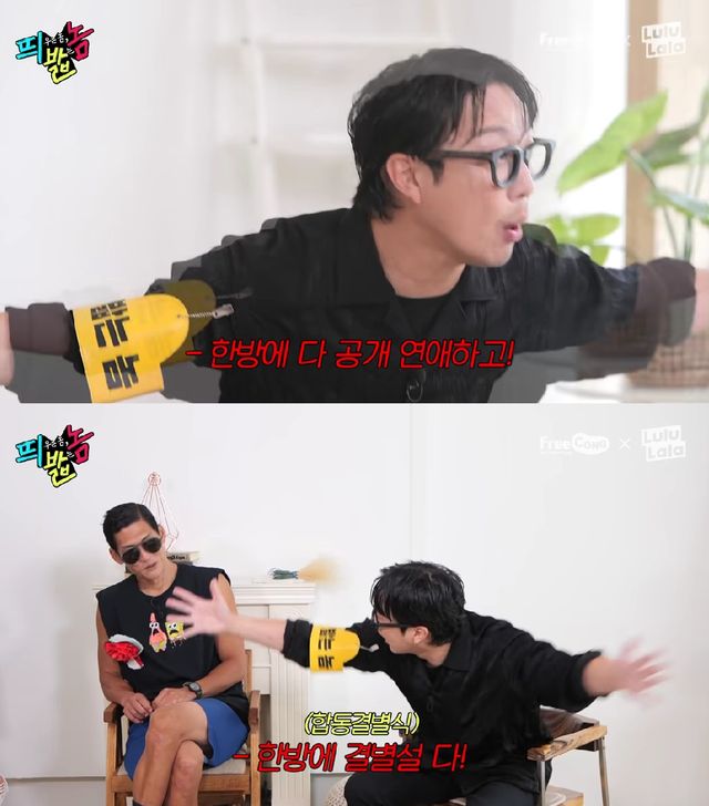 "이랬으면 좋겠어"라고 운을 뗀 하하는 "전체 아이돌 중 사귀는 아이들이 기획사끼리 이야기해 한방에 다 터트리는 거다. 누구 것을 (기사) 쓸지 모르게 하는 거다"라며 발상의 전환이 필요하다고 이야기 했다.
