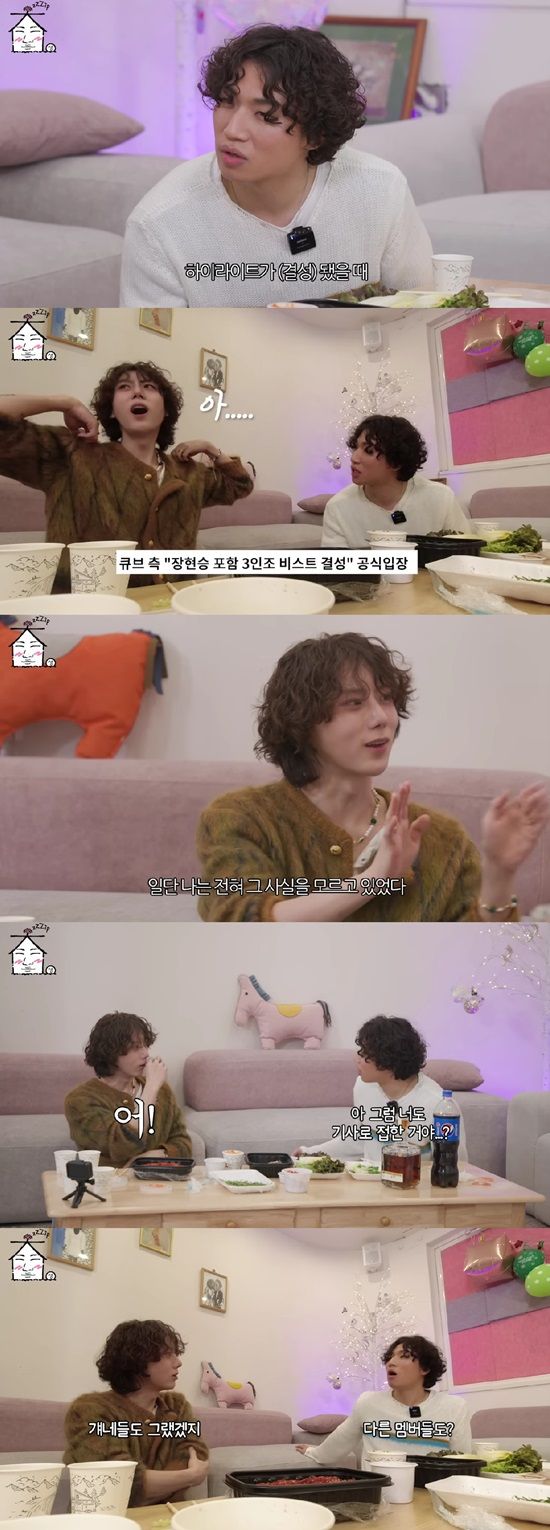 이에 놀란 대성은 "다른 멤버들도 기사를 보고 안 거냐"고 물었고 '그렇다'고 답한 장현승은 "(멤버들끼리) 이야기도 안했다. 지금 말을 듣고 보니 (다른 멤버들은) 이미 회사랑 상의 됐던 걸로 생각할 수 있겠다. 하지만 오해다"라고 해명했다.