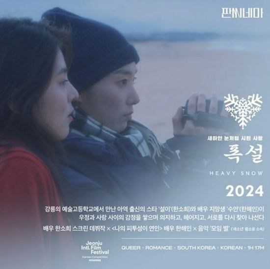'폭설'은 연기와 영화를 놓고 고민하는 강릉 예술고등학교의 두 소녀 수안(한해인 분)과 설이(한소희)의 우정과 사랑, 방황을 담은 작품. 제24회 전주영화제 한국경쟁 부문 후보로 진줄해 전주영화제에서 처음으로 공개될 예정이다.