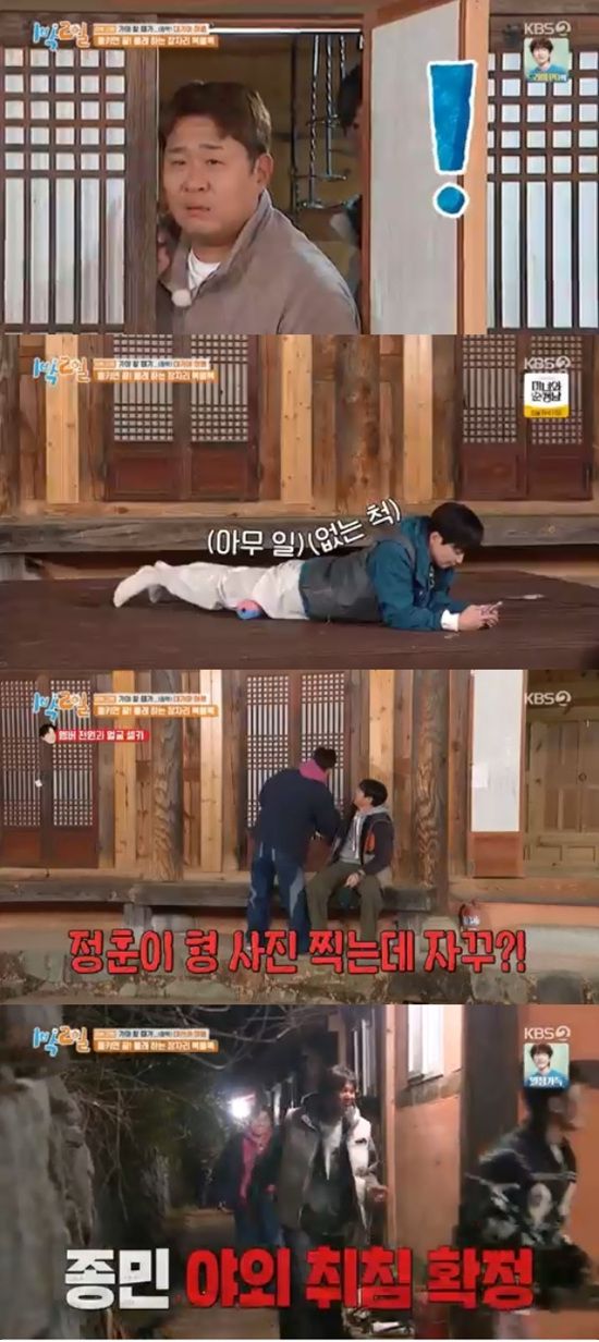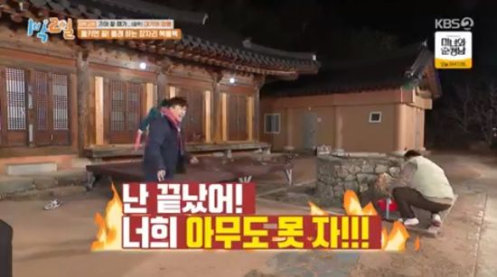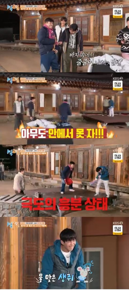 김종민은 바지 속에 달걀을 넣고 다니다가 다 깨지면서 야외취침 확정되자 "다 죽었어. 아무도 못 자"라고 소리치더니 딘딘을 향해 물을 퍼부으며 폭주했다.