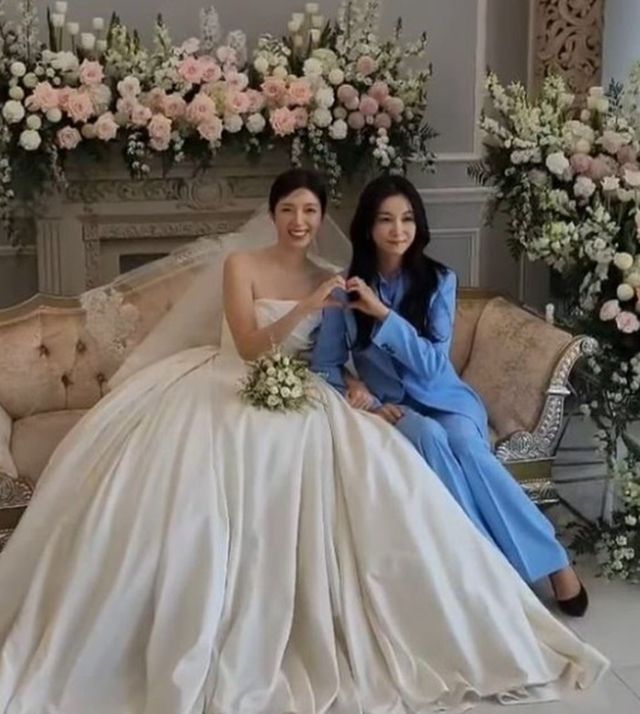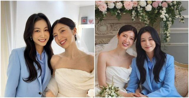공개된 사진 속에는 하늘색 슈트를 입은 김옥빈과 오프숄더 웨딩드레스를 입고 환한 미소를 짓고 있는 채서진 모습이 담겼다.