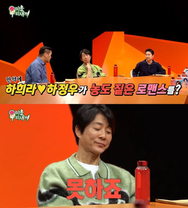 이날 MC 서장훈은 최수종에게 “예민한 질문 하나 하겠다”며 “지난번에 하희라 씨가 출연해서 한 얘기다. 하정우 씨와 로맨스 작품을 하고 싶다고 하더라. 농도가 짙은 멜로 드라마를 찍게 된다면 어떻겠나”라고 물었다.