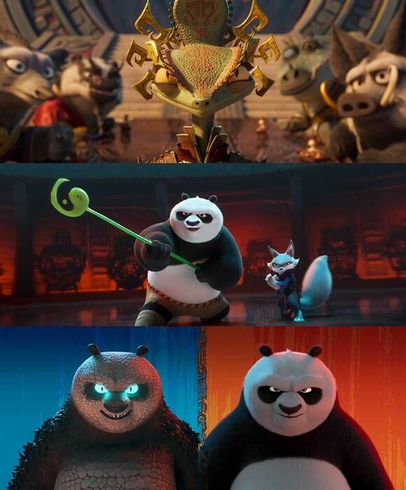 포(위쪽)는 새로운 빌런이자 쿵푸 마스터들의 능력을 모두 복제해 새로운 악의 힘을 축적하는 카멜레온과 맞서며 성장한다. /유니버설 픽쳐스