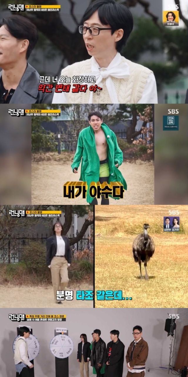 이날 방송은 ‘런닝맨’의 시그니처인 ‘연령고지에 봄이 왔나봐’ 레이스로 꾸며져 기대감을 더했다. 본격 레이스에 앞서 새 포스터 촬영이 진행됐고, 지난주 레이스였던 ‘힙이 차오른다’ 벌칙자들인 유재석, 김종국, 하하, 양세찬의 충격적인 ‘팬츠리스’ 룩이 공개됐다. 특히 양세찬은 뜻밖의 야성미를 뽐내 폭소를 자아냈다.