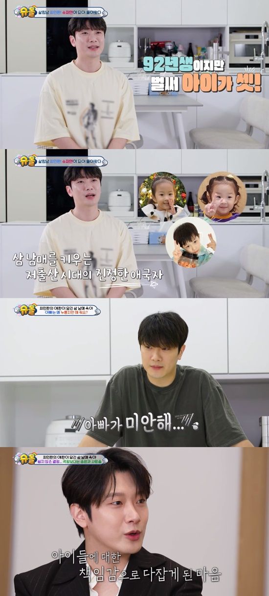 7일 공개된 KBS 2TV '슈퍼맨이 돌아왔다(이하 슈돌)'에는 최민환이 새로운 슈퍼맨 가족으로 합류했다. 그는 지난 해 12월 율희와의 이혼을 발표하고 현재 첫째 아들 재율과 둘째 아린과 아윤 쌍둥이를 홀로 키우고 있다.
