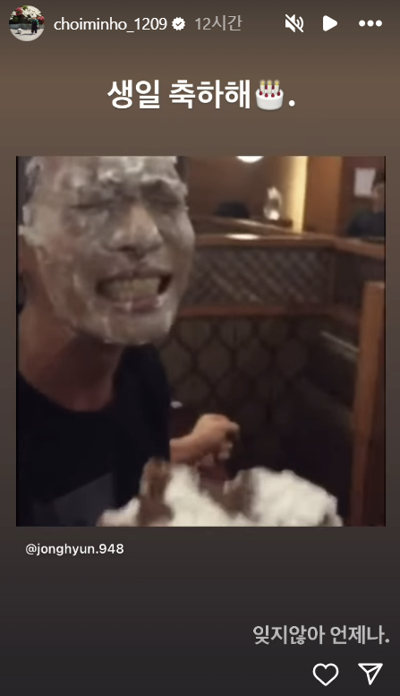 멤버 민호는 이날 자신의 SNS 스토리에 과거 종현의 생일파티에서 찍은 영상을 공유하며 “잊지않아 언제나”라고 남겼다. 영상 속 종현은 생크림 케이크를 얼굴에 잔뜩 묻힌 모습으로 환하게 웃고 있다.