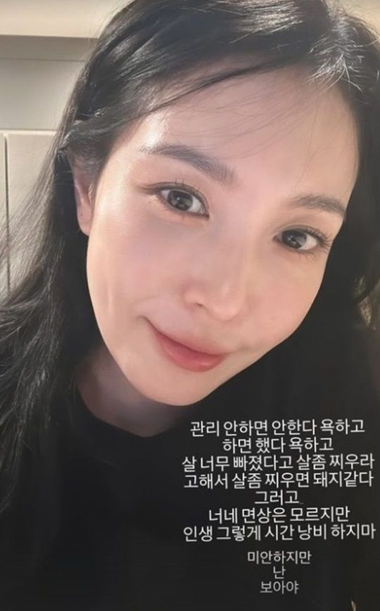 보아는 "관리 안하면 안한다 욕하고 하면 했다 욕하고. 살 너무 빠졌다고 살 좀 찌우라고 해서 살 좀 찌우면 돼지같다 그러고. 너네 면상은 모르지만 인생 그렇게 시간 낭비하지마. 미안하지만 난 보아야"라며 속마음을 토로하기도 했다.