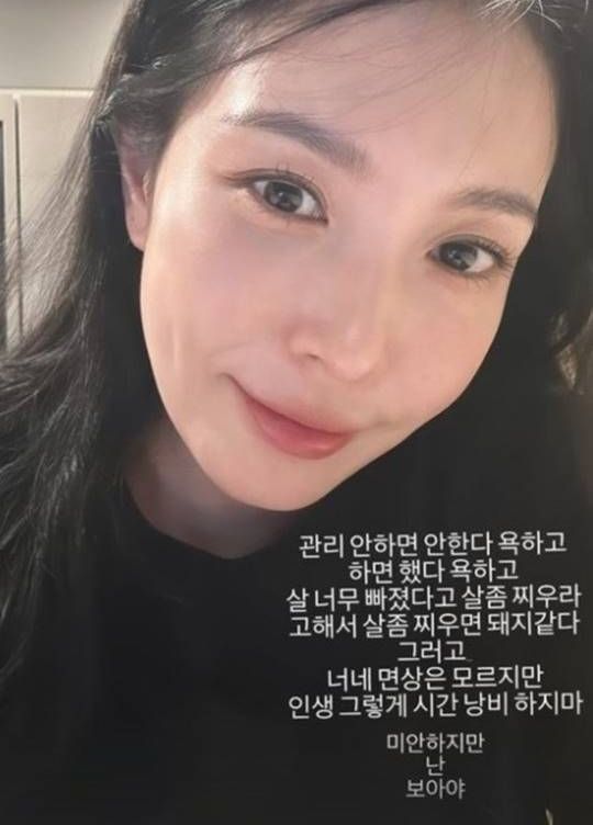 또한 지난달 "관리 안 하면 안 한다 욕하고 하면 했다 욕하고. 살 너무 빠졌다고 살 좀 찌우라고 해서 살 좀 찌우면 돼지같다 그러고"라며 "너네 면상은 모르지만 인생 그렇게 시간 낭비하지 마. 미안하지만 난 보아야"라며 악플러들을 향한 일침을 가했다.