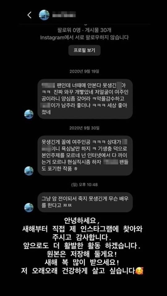 박소담은 외모 평가 악플을 캡쳐하며 "앞으로도 더 활발한 활동을 하겠다. 원본은 저장해두겠다. 저 오래오래 건강하게 살고싶다"며 게시글을 올렸다.