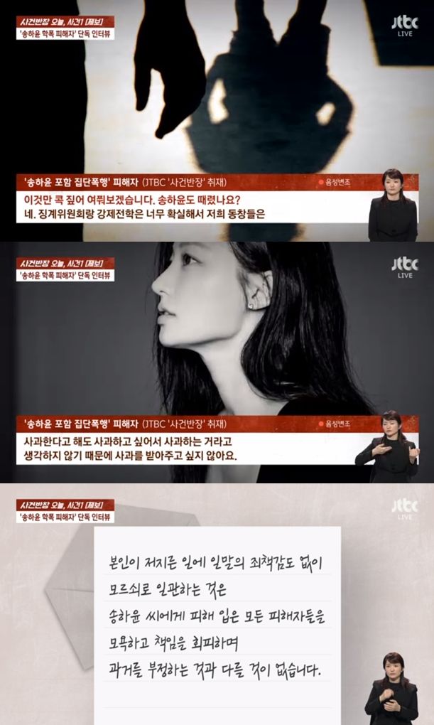 그러면서 세 명의 가해자가 있다는 A씨는 "원래 친했던 친구 둘은 집 앞에 와서 무릎 꿇고 사과를 했다. 송하윤은 사과를 한 적이 없다"고 말했다.