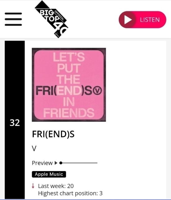 방탄소년단(BTS) 뷔의 디지털 싱글 '프렌즈'(FRI(END)S)가 영국 최대 차트인 '오피셜 빅 톱 40' 32위를 기록했다. 이로써 이 노래는 4주 연속 진입이라는 기록을 세웠다.