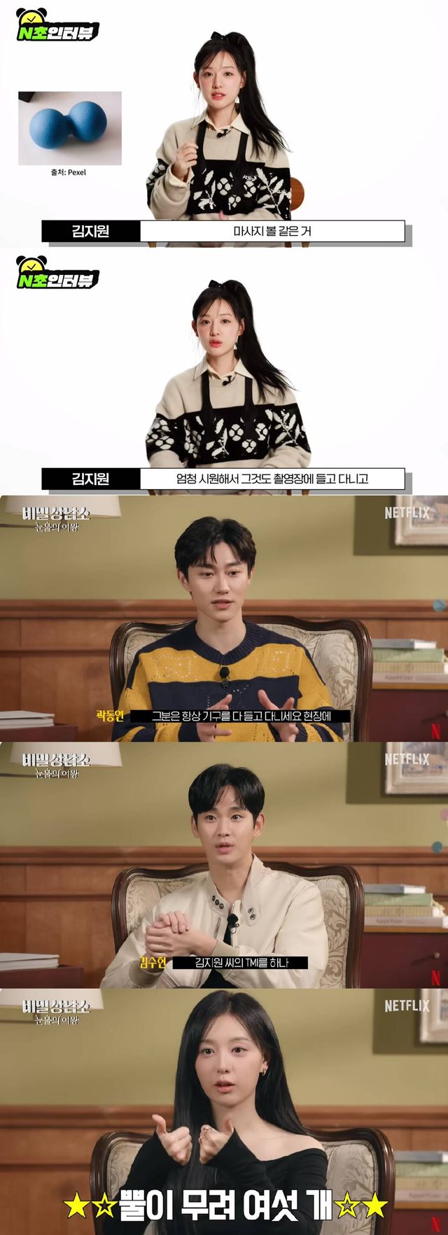 김지원은 "괄사도 좋아하고, 마사지 볼 같은 것 등에 대고 굴리면 시원해서 촬영장에 들고 다니고 있다"고 말했다.