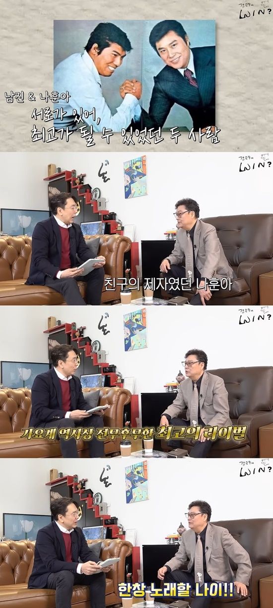이에 남진은 "그렇다"라고 고개를 끄덕이며 "남진의 시대가 있던것도 멋진 라이벌이었던 나훈아 씨가 있었기 때문이다. 같이 라이벌의 한 시대를 만들 수 있었다는 것이 좋다"고 말했다.