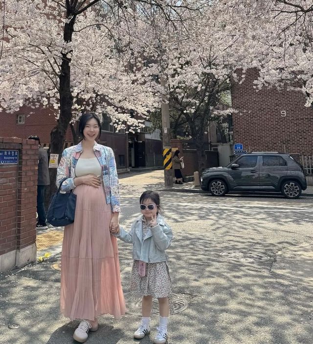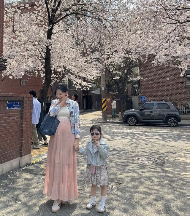 공개된 사진에서 이다은은 벚꽃 아래에서 딸 리은 양의 손을 잡고 카메라를 응시하고 있다.