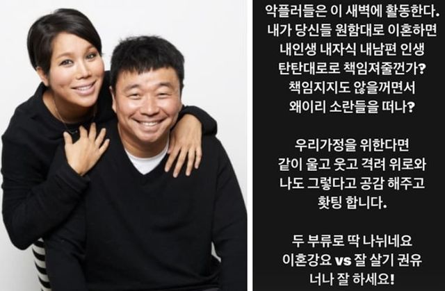 끝으로, "두 부류로 딱 나뉜다, 이혼 강요 vs 잘 살기 권유"라며 "너나 잘하세요!"라고 경고의 뜻을 전했습니다.