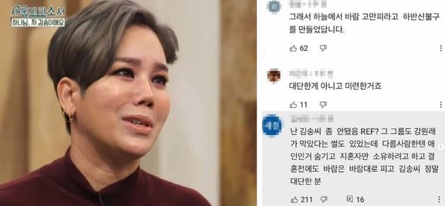 이날 두 사람은 부부간의 대화 단절과 소통 부재에 대한 고민을 토로한 바 있습니다.이 방송 이후 김송의 SNS에 각종 누리꾼의 이혼 권유하는 댓글이 쏟아졌습니다.