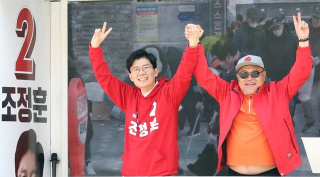 조정훈 마포구갑 국회의원 후보가 1일 오후 서울 마포구 공덕시장에서 유세 차량에 올라 지지를 호소하며 인사를 하고 있다. 오른쪽은 가수 김흥국. / 뉴스1