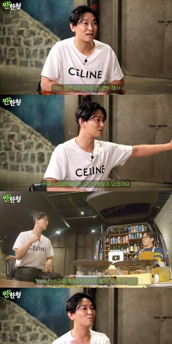 이어 그는 "'1대 1로 붙자'가 아닌 '우리 형 데리고 올거야' 이러는거다. 비겁하다고 생각했다"고 설명했다. "내가 얼마나 다행이냐면 직업이 이건(배우)데, 어릴 때 그런 걸(학교 폭력) 안 했다는 게 너무 다행이다. 오히려 나는 고등학교 졸업할 때까지 괴롭힘을 당했다"고 고백했다. "단체의 무리가 나한테 굴복하라고 하더라. 그런데 비겁하지만 숙였다"고 회상했다.