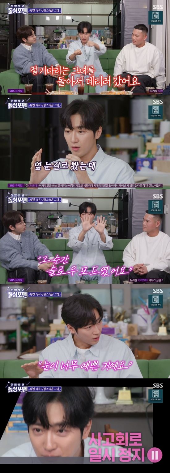 또한 "열심히 찾은 밥집에 갔다. 아내를 보는데 초점이 자꾸 나가게 되더라. 나온 음식을 딱 먹었는데 너무 맛이 없었다. 첫 입 먹고 눈이 동그래져서 나를 보는데 또 너무 예뻤다"고 말했다.